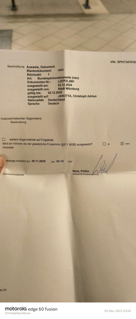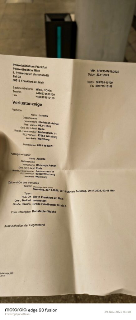 Anbei die Verlust und Diebstahlsanzeige wegen Diebstahl. Anbei Fotos der Polizei Frankfurt die dies bestätigen. Bis heute ist sie Sache ungeklärt und der Ausweis ist noch immer gestohlen. Ein neuer ist bereits bestellt , aber der alte ist ein Diebstahl. Es konnten konten auf meinen Namen eröffnet werden und mein Name missbraucht werden. Deshalb mache ich das auf dieser Website öffentlich.